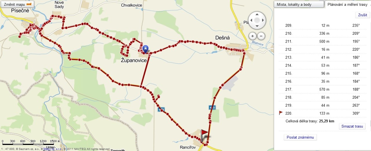 Délka pěší trasy 25,5km. Celkem 42 cache.